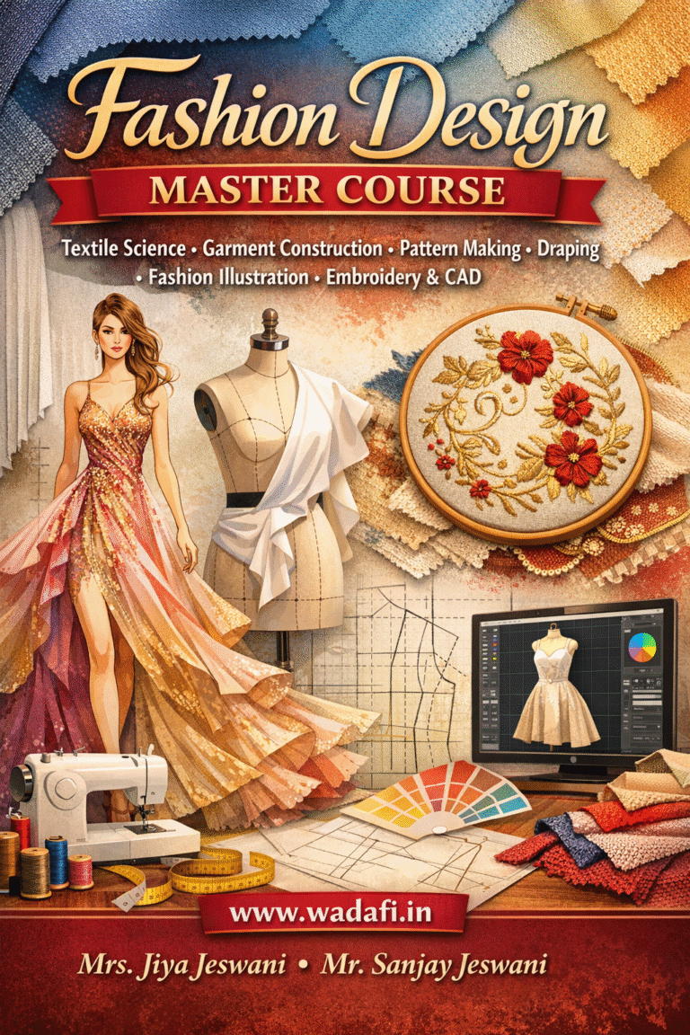WADAFI’s Fashion Designing Master Course is a comprehensive, industry-aligned program that covers technical mastery, creative development, styling, digital design, and fashion entrepreneurship. From traditional embroidery to modern CAD-based portfolios, our syllabus prepares students for every vertical of the fashion world – ethnic, western, bridal, couture, and kidswear.